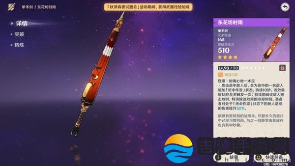 [page]第6页:东花坊时雨[/page]东花坊时雨可以从下图看见,强化到满级其属性值和锻造武器铁峰刺是一样的