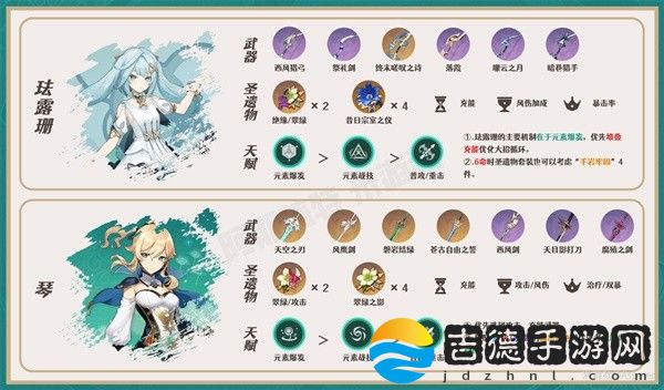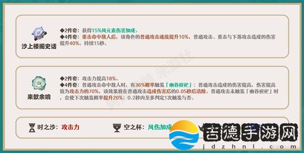 ②.中期过渡可以选择攻击2件(角斗/追忆/辰砂/余响)、风伤2件(沙楼/翠绿)的相互2+2散搭组合。
