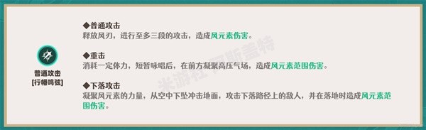 ②.普通攻击遵循“命中同一敌人时2.5秒内每2次攻击产生元素附着”的规则,每次重击均能产生元素效果,均为弱风元素。