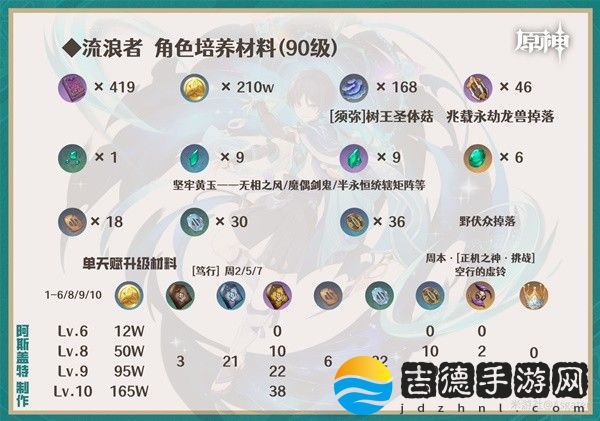 流浪者是一名周期输出的风伤主C,通过元素战技进入浮空状态强化普攻/重击进行输出,同时拥有可观的大招倍率,在0命时机制较为完整,通过利用天赋技能的接触元素机制获得不同增益效果进而产生更大的提升,整体输出能力可观。(如下培养一图流~)