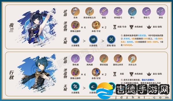 夜兰施放元素爆发后可以增加场上角色造成的伤害,并且其大招伤害也比较可观;莱依拉的护盾则提高队伍的生存能力。流浪者配合夜兰、莱依拉可以触发固有天赋1的水、冰增益效果(提高空居力上限20点、增加20%暴击率)从而进一步提高流浪者的输出能力。