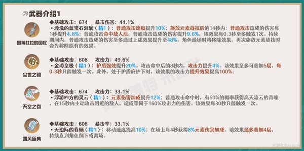 总的来说,选择武器时优先五星(不灭月华、千夜浮梦除外),在四星中优先考虑流浪乐章、匣里日月,其次则是各类攻击词条武器,如证誓之明瞳、嘟嘟可故事集等。