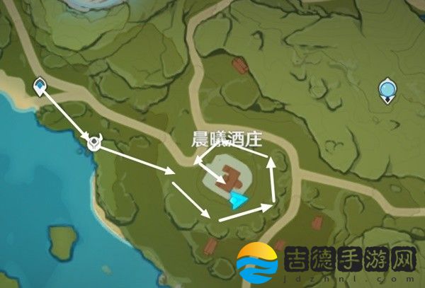 7.第七个地方在晨曦酒店周围,非常建议采集,一次性采集10+晶核!路线如图↓从传送描点按照路线来,爬一个山坡看到三只晶蝶,之后再沿着晨曦酒店绕一圈抓晶蝶,携带角色早柚更方便!每天都可以抓一下!