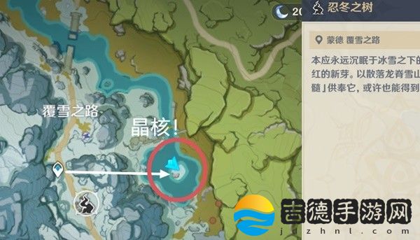 3.第三个地方在龙脊雪山覆雪之路附近,从忍冬之树旁传送描点出发,按照标记路线到达小岛获得三个晶核!