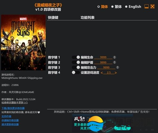 点击简体、繁体、English,可以切换语言 (切换语言后修改器将把该语言设置为默认语言)