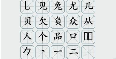 本关的可以找出二十个字为:丶、一、二、口、吅、吕、品、人、个、从、众、欠、负、儿、尤、兔、免、见、贝、乚。