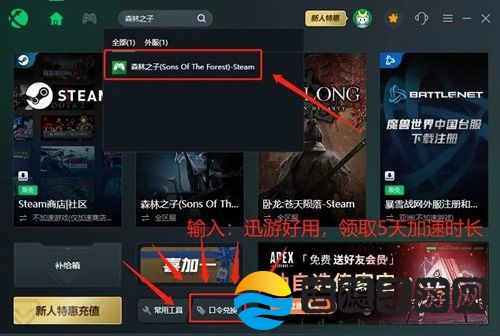 也可能是玩家本地网络在连接《森林之子》服务 器时,出现波动、 不稳定的情况,导致游戏出现卡顿加载、闪退、卡顿、卡死的问题。玩家可以借助【迅游加速工具】对网络进行优化,优化之后可以有效优化网络,降低延迟,解决游戏问题,助力流畅游玩。现在还可以点击口令兑换,输入“迅游好用”领取5天时长。