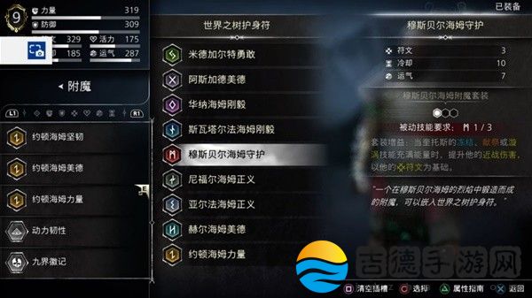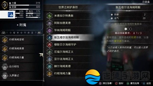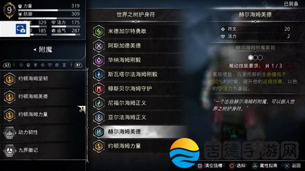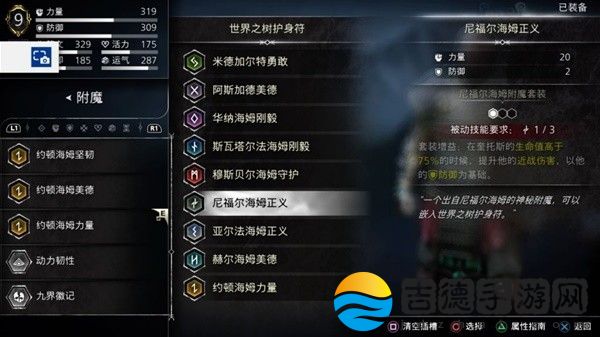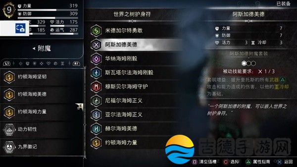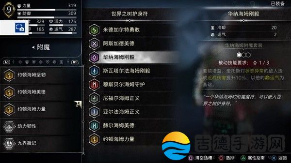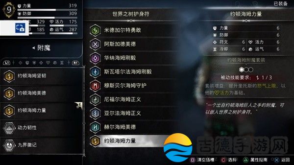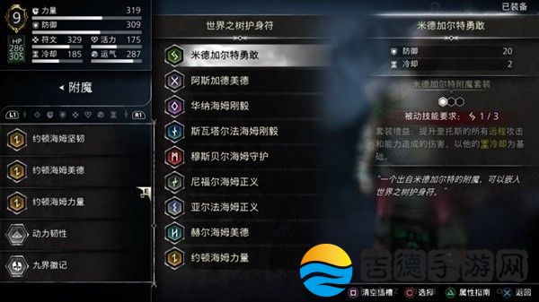 触发方法为护身符九个槽插上九个国度的附魔各一个,不过每个国度都有一个比较特殊的,像约顿海姆力量全属性加6,尼尔福海姆正义加20力量这种,我是这样插的。