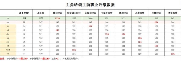 这里着重说明一下【符文剑士】,属性整体比较平均,没有特别大的短板,符文剑士32级有着1000+hp和200+mp。