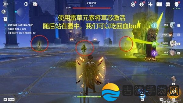 击败方法:在开局进入挑战以后,我们就需要利用雷草元素,将三处【治愈草芯】激活,使其变成活化状态,随后我们就可以站在【治愈草芯】的圈内进行战斗,我们会吃到回血效果。当无相之草进入虚弱状态以后,我们还是老方法,雷元素激活,使其速度增加,这样,我们的挑战就算顺利完成啦。