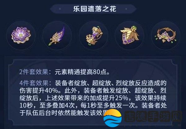 4件套效果为提升绽放、超绽放、烈绽放的反应伤害,最低40%,后续通过叠层最多可提升80%。
