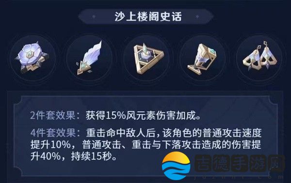2件套效果为15%风伤加成,与2翠绿的效果相同,同时限制风系角色使用。