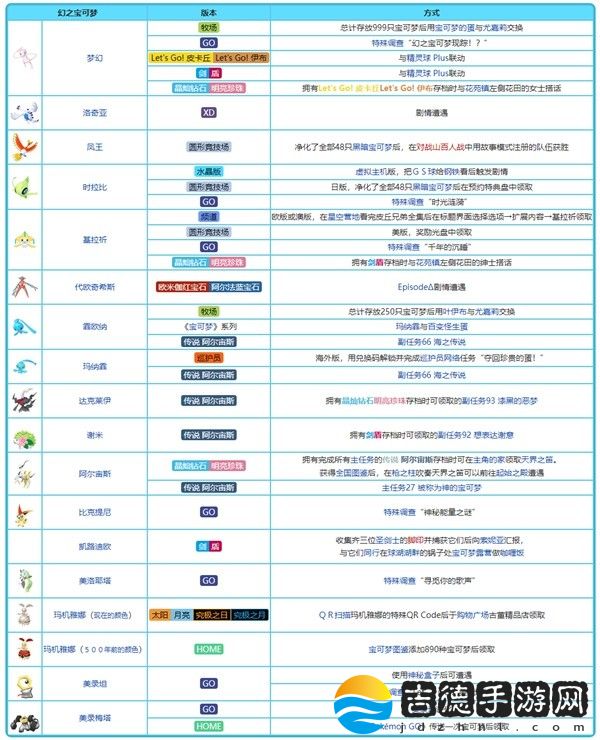 以下列出了无时间限制、最终可传入《Pokémon HOME》的获得幻之宝可梦的方式。不包括游戏漏洞。