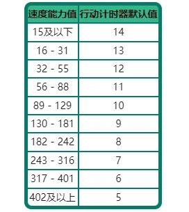 计时器的默认值由宝可梦的速度决定,使用招式或道具后,会先重置计时器,再对使用者执行招式或道具的修正数值。各个速度对应的默认值如下: