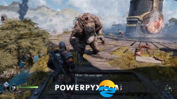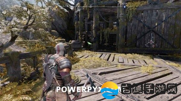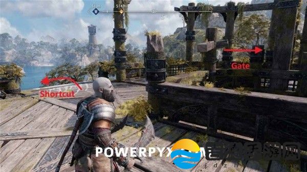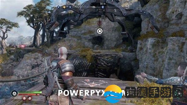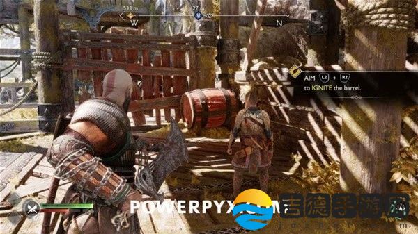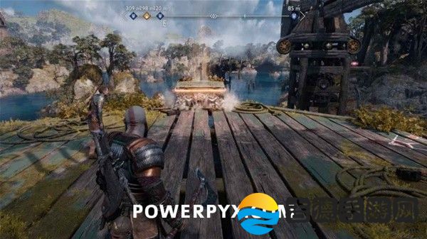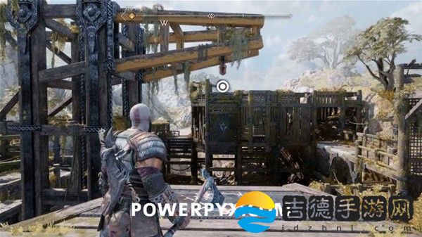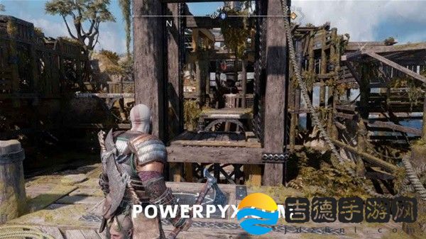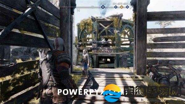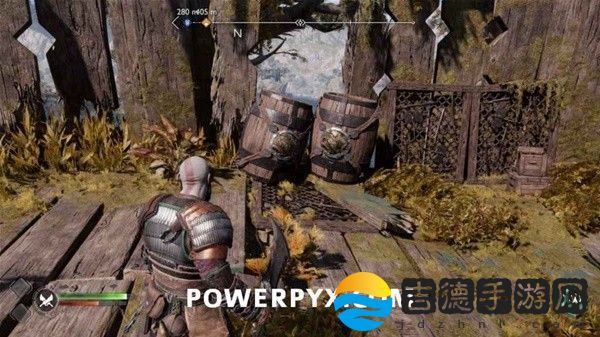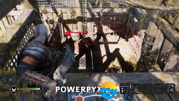角落里有一些桶,让阿特柔斯摧毁掉,这里是另一条捷径。回到齿轮处,操作齿轮到最高,然后返回并跳过缝隙。