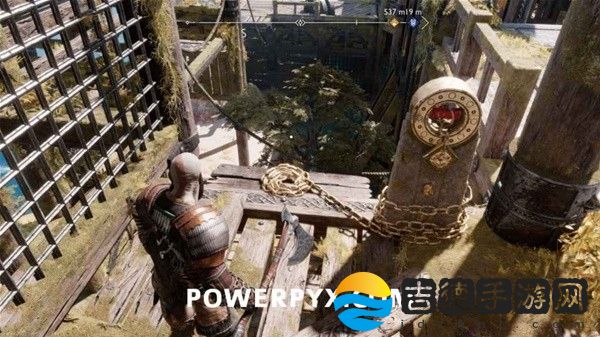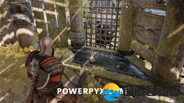 爬到上方平台,来到下图所示位置。左边放下铁链就能下去操作齿轮了;右边有一个可以打开的大门,从铁门进去,跳到下层打爆炸药桶。