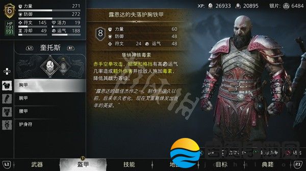 盔甲包括胸甲、腕甲、腰甲以及护身符四部分。