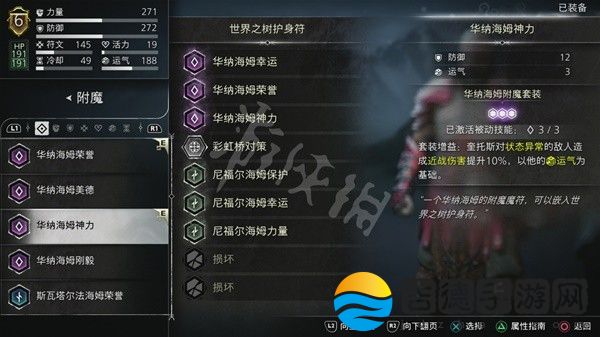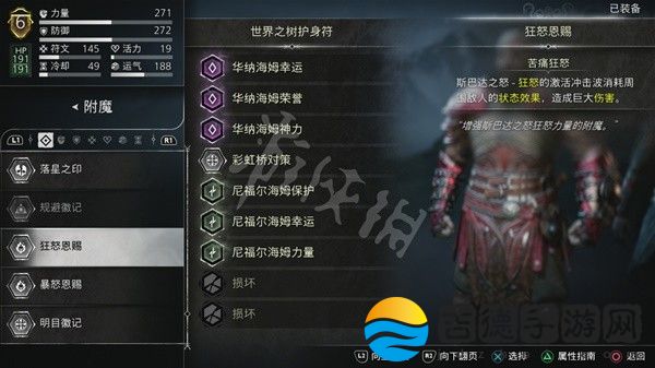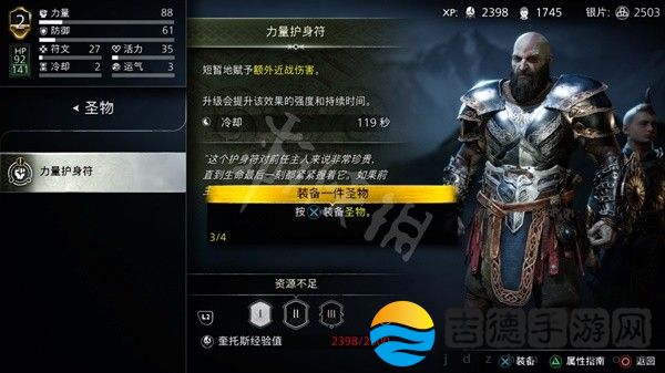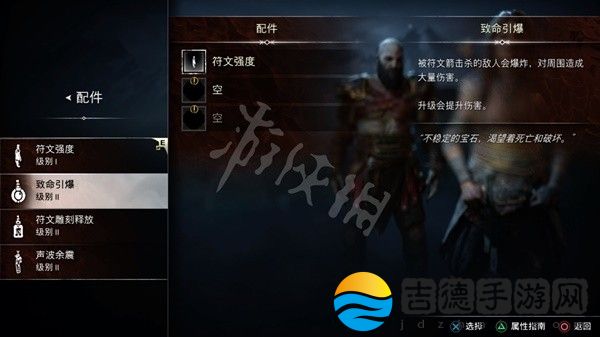 护身符系统会在游戏中期解锁,玩家可以在护身符插槽中装备各种来自不同界域的附魔铭文,每个铭文都会为奎托斯提供一定的属性数值加成,装备3个同一界域的附魔可以触发对应界域附魔套装效果。