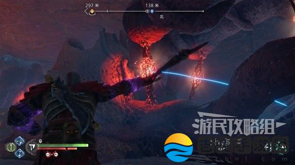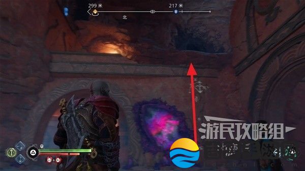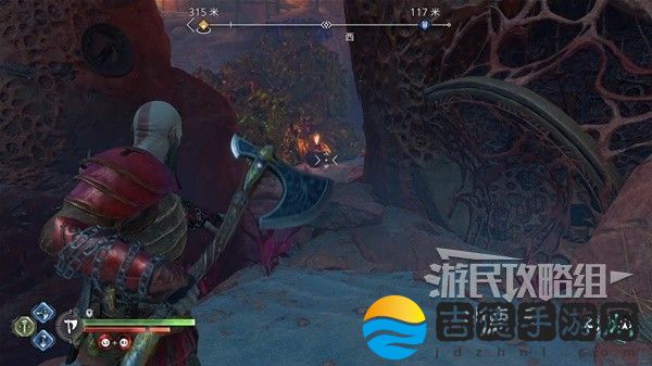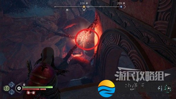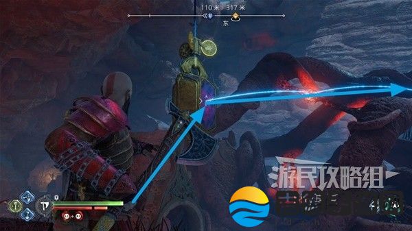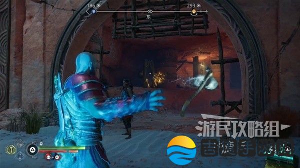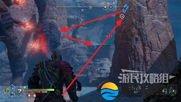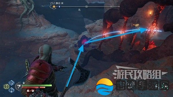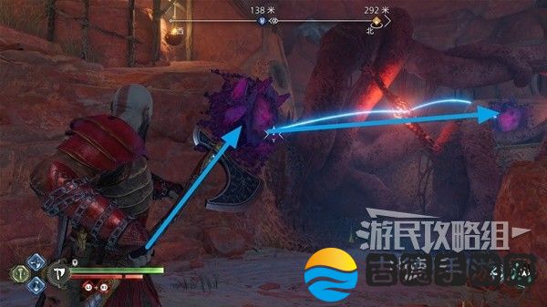 接下来往前走会遇到自爆小妖,然后来到下图位置,需要站在图中位置投掷斧子,就能打开通路。