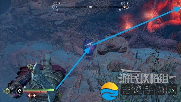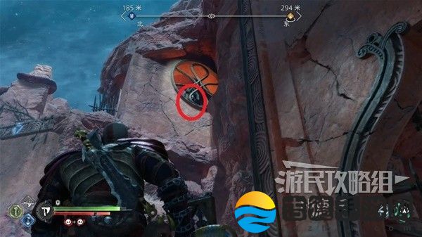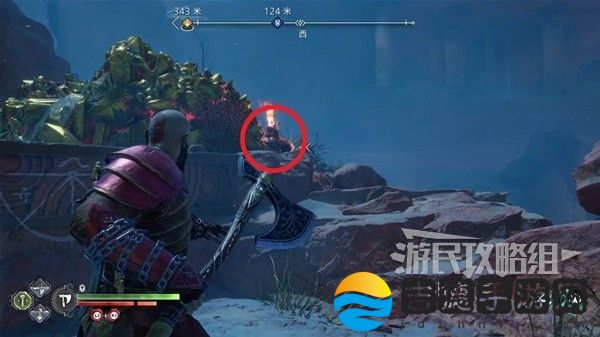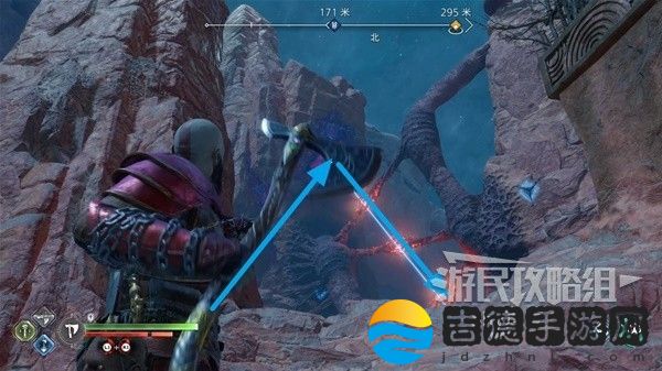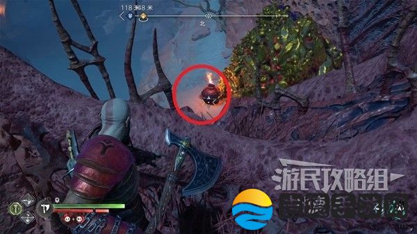 来到刚刚金石阻挡的位置,如图投掷斧子,可以过去打开一个宝箱。