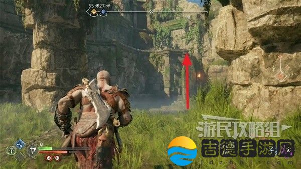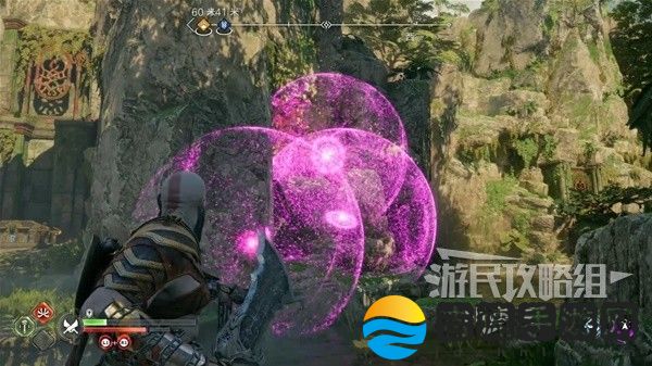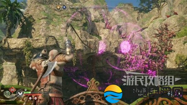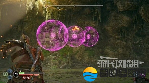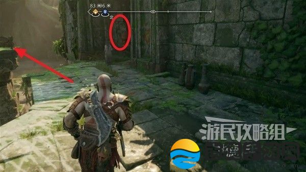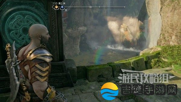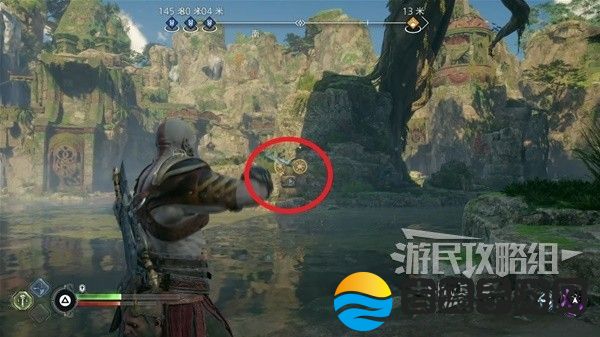 在靠悬崖的一个台子上可以看到最后一个装置,用飞斧调整装置,虽然看不到下面的符号,但是可以看右侧三女神宝箱的符文锁开了,那就是调整对了。