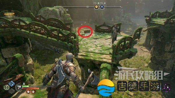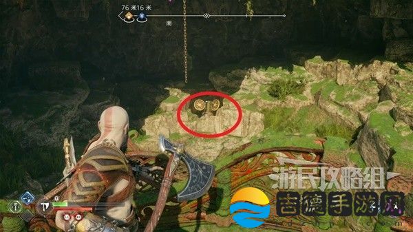 上来以后,红圈处有一个小屋子,里面有植物陷阱,破坏掉可以打开一个宝箱,打开获得【关键物品-露恩达的破碎臂套】。然后跳到左边的台子上。