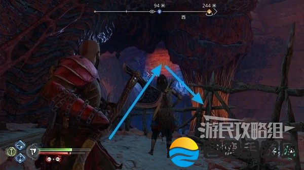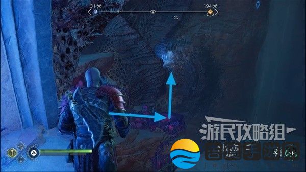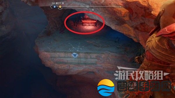 下来之后,向右走,沿着箭头上去可以拾取一个宝箱。