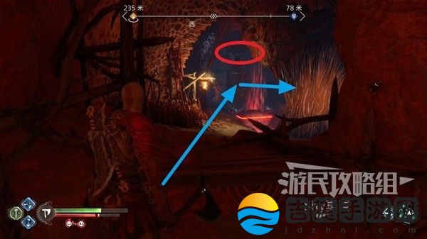 下一场战斗结束后,爬上高台,回头向下看,利用黄昏石清理厚蜂巢。