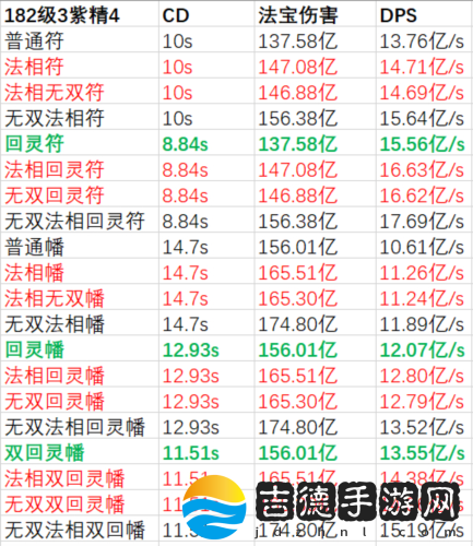 3.幡凭借较高的法攻加成和伤害上限,不算词缀的幡,其伤害也比法相符要高。可以说幡的伤害本身是足够的,其弱点就在于偏长的CD,CD有多重要,我们下一层楼讲。回灵可以让幡的CD从14.7秒变为12.9秒,缩短1.8秒,大幅度提升幡的输出频率。因此对于幡来讲,词缀优先级和符相比是反过来的,如果要做选择,核心词缀是回灵,法相对幡来讲可有可无,是锦上添花,对于幡来说,应该是锁住金回灵往外洗法相。
