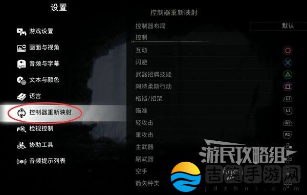 游戏主菜单选择“设置-控制器重新映射”。或者在游戏中暂停,在选项里选择“设置-控制器重新映射”。