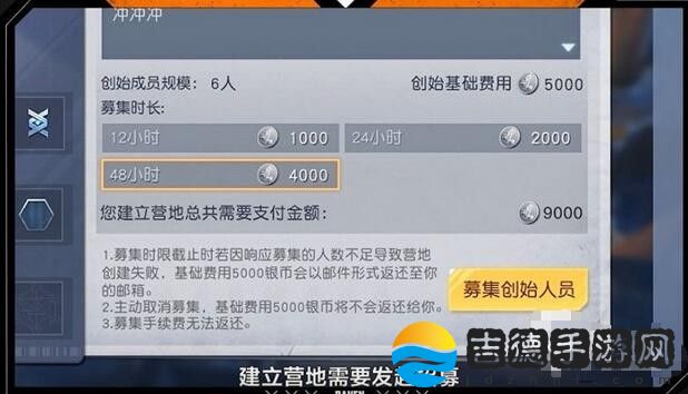 3、在规定的时间内,还没筹齐人数的就算创建失败,会将基础费用五千银币以邮件的方式返还给你,要是主动取消就不会返还,玩家可以提前约好伙伴,能够大大提高创建营地的成功率。