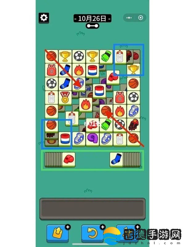 蓝框区域别动,箭头→区域从外往里一直消,绿框区域盲牌配合箭头区域(少用),消到后期会变成斜着并排的三个区域,重叠的会特别深,但是三个区域配合着消是能凑对的,前期最好不要用道具,如果还没到并排的三个区域就用了道具直接重开,后期消到红区消不了了用道具三洗牌,洗牌之后才可以动蓝框区域的牌(少用),然后再复活,最后道具一移出。