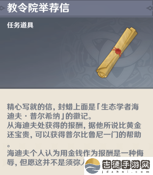这下,海迪夫相关的三个小任务就全部完成了,我们会获得一封海迪夫写的举荐信,虽然须弥主线任务都结束了我们还是没用上……