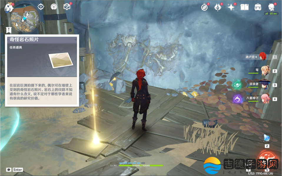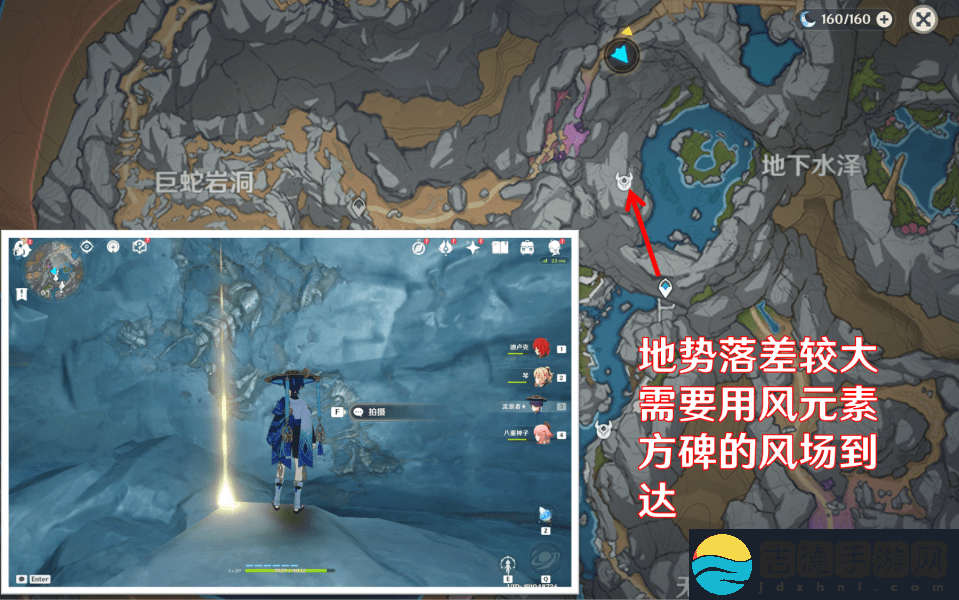 传送至地下水泽遗迹锚点,往箭头示意方向走,可以看见一个风元素方碑,激活后出现风场,顺着风场飞到上方即可看见化石。
