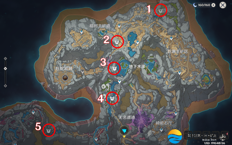 本任务需要我们交付五张不同的化石照片,化石拍摄点分布在了地下矿区的各处,下图是全部点位概览,接下来我将以此顺序展开叙述。