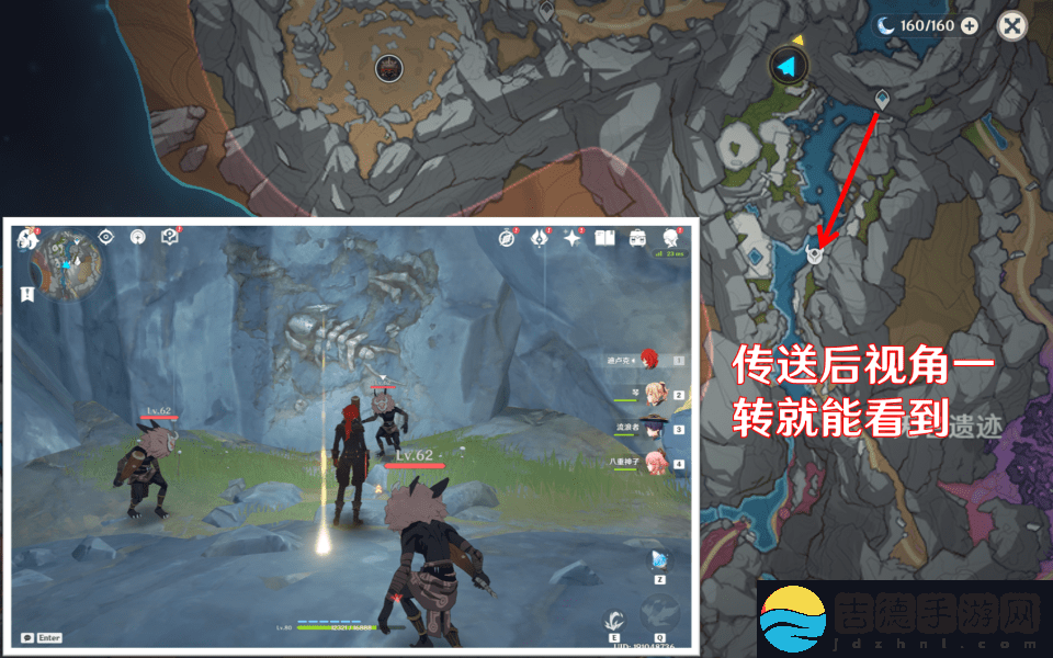 还是传送到地下水泽遗迹锚点,将视角向南移就能看到发光点了,化石旁围着几个丘丘人。