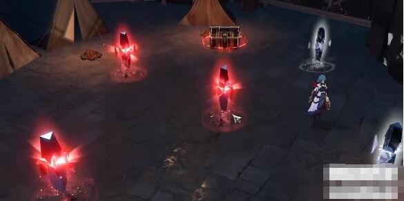 4、在宝箱下一层,能够一堆帐篷的中间发现一个物理尖碑,接着使用物理攻击解锁。