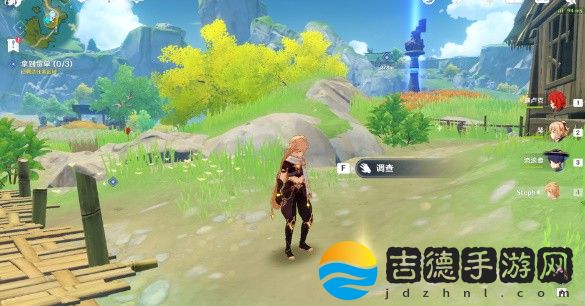 5、传送至荻花洲七天神像处锚点,往前方小屋走去,在屋子旁找到一个发光的调查点,点击调查拿到货单;