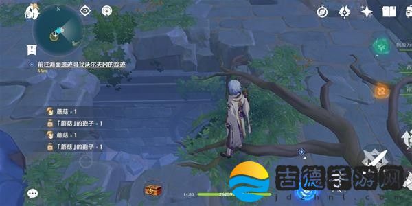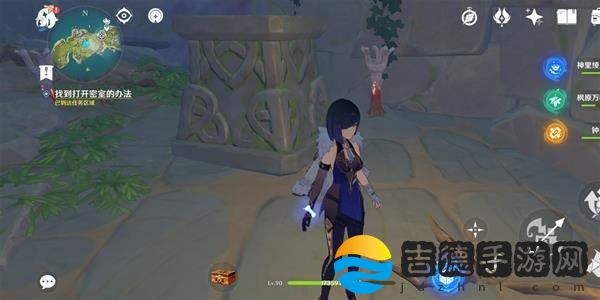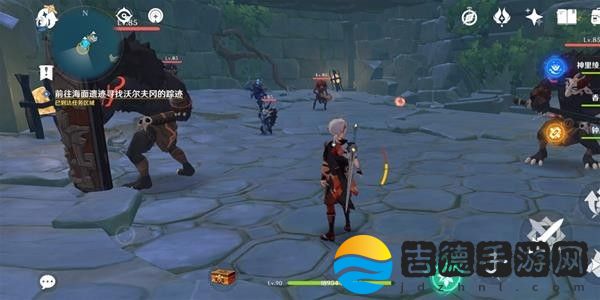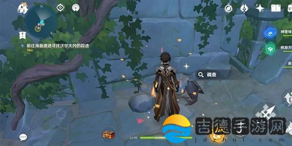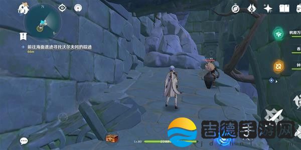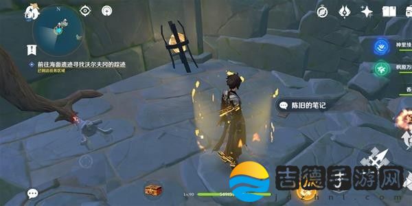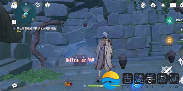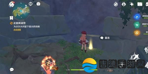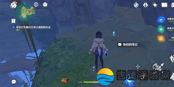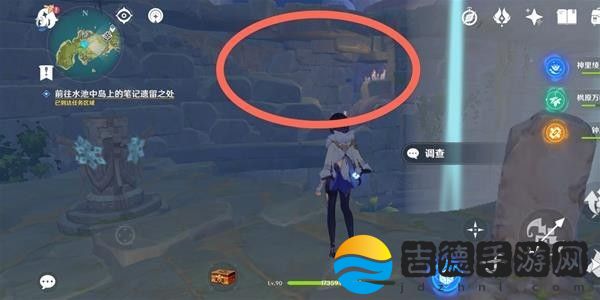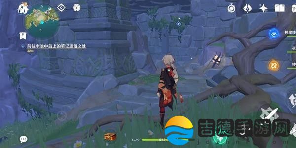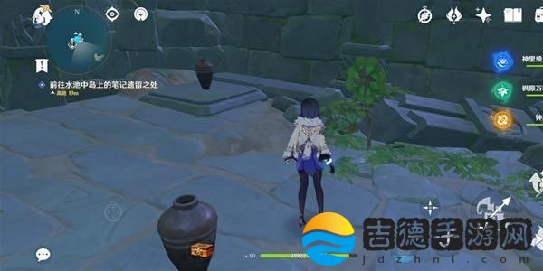 然后我们回到水占镜的位置,回到现在的危危岛,阅读一下笔记,跟着指引来到遗迹,这里有一个洞,跳下去。