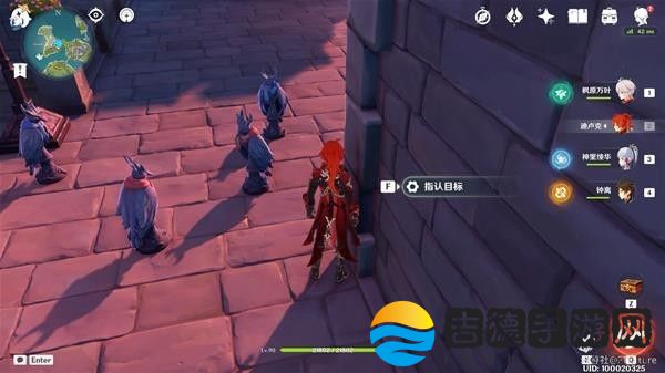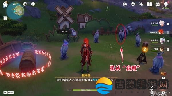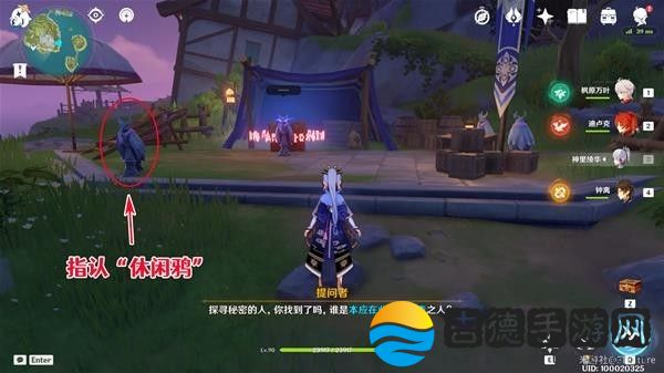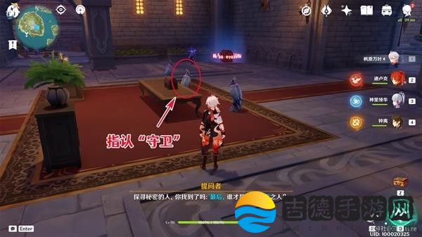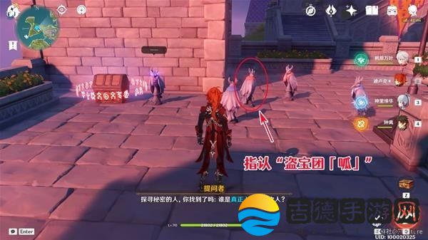注意,这里由于雕像们站的很近,直接过去选无法分辨出哪个选项对应哪个角色,很容易选错,建议来我下图的位置,贴着墙一点点挪到只能选到“盗宝团「呱」”的位置再进行指认。