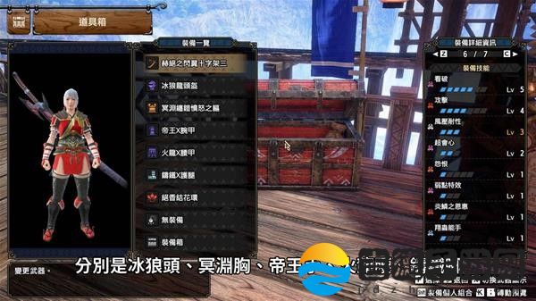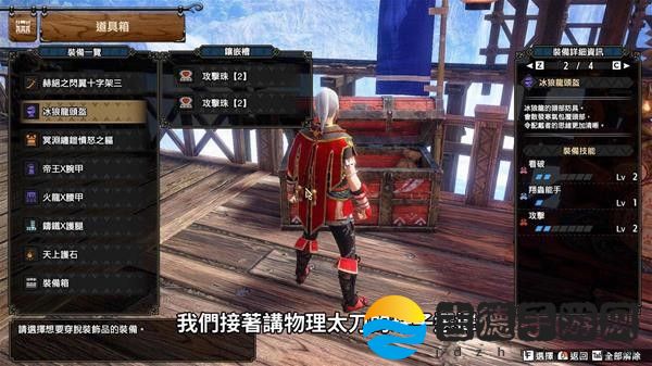 物理太刀防具先来说说物理太刀的防具部分,我的选择是这套,分别是冰狼头、冥渊胸、帝王手、火龙腰、铸铁脚,这套重点技能有看破5、攻击4、超会心2、弱点特效1、翔虫能手1,整套带有两个3级洞、四个2级洞跟两个1级洞,这里特别说一下,武器我会推荐搭配自带一个2级洞以上的太刀,原因我会在等等的珠子部分一起讲。