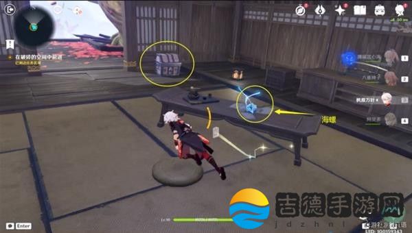 (3)一直向前,看到拉杆,启动,然后飞到这里,下楼梯路上有一个牌子,记得拾取,来到下面,如下图,看到桌子上有一个海螺,旁边一个精致的宝箱1。