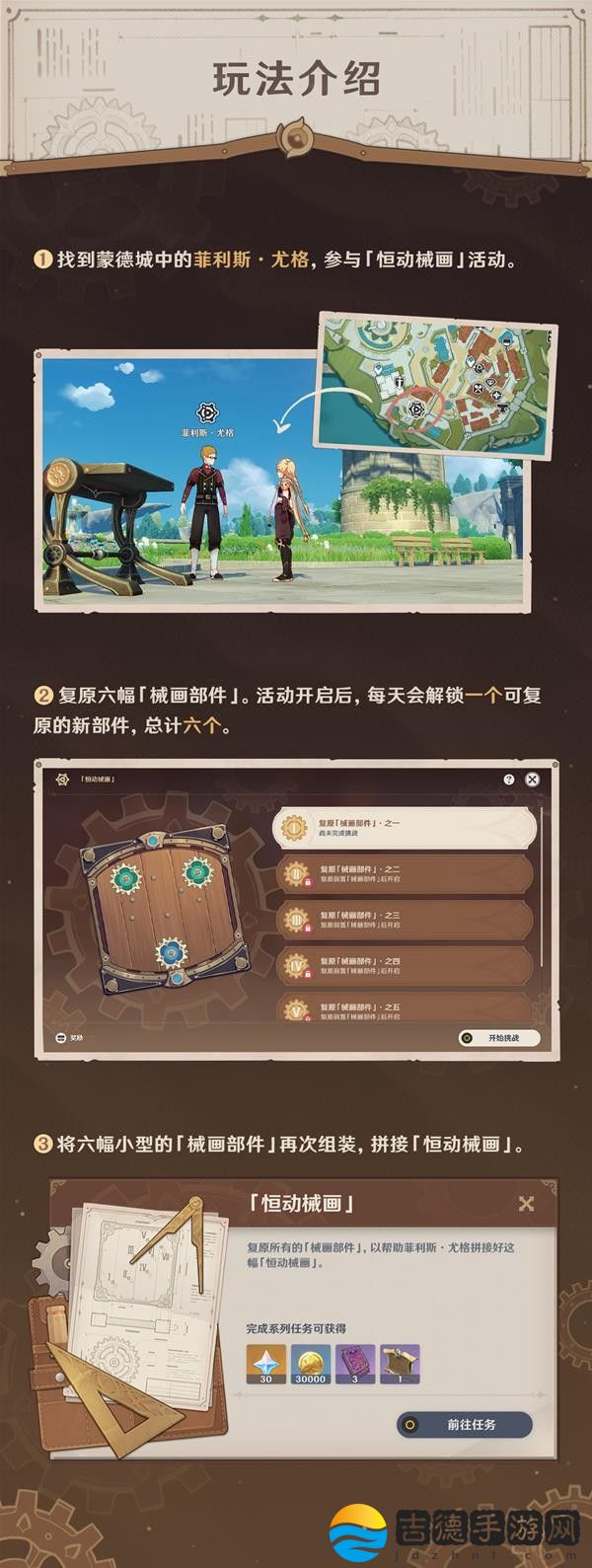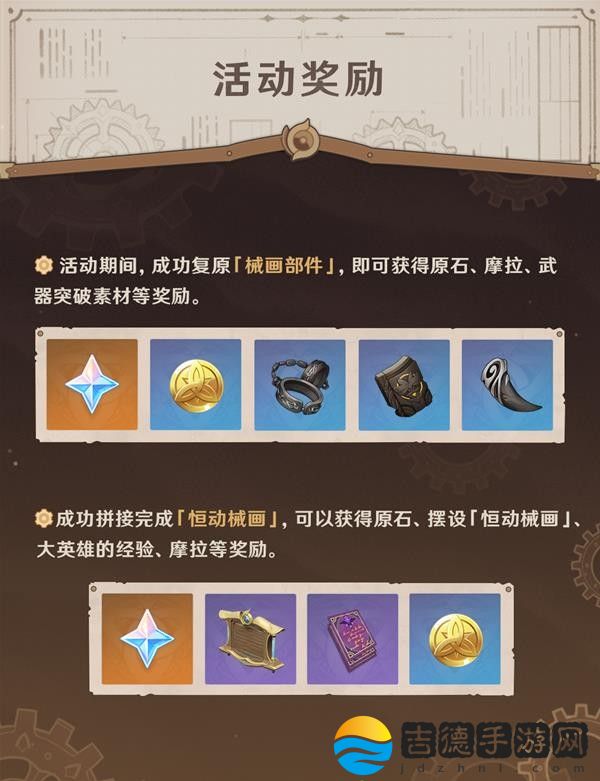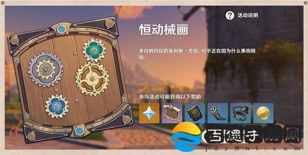 活动期间,帮助来自枫丹廷的菲利斯·尤格解决烦恼,复原「械画部件」并拼接「恒动械画」,完成后即可获取原石、摆设、大英雄的经验、武器突破素材、摩拉等奖励。