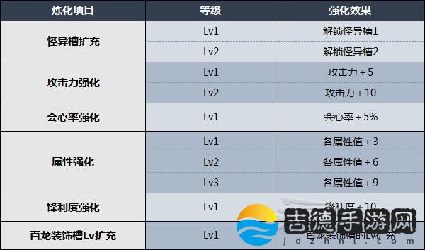 武器的怪异炼化基于怪异槽数量,总共有5个怪异槽,其中2个需要通过「怪异槽扩充」来解锁。各强化项目存在等级设定,强化效果随等级提升而增加,但使用的怪异槽数量也会增加,这一点需要合理分配。怪异槽强化效果如下。
