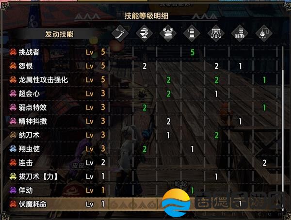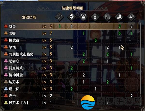 然后根据武器的不同,还有一点点区别。由于我所使用的武器中,泥翁太和鬼神斩破刀(水和雷属性)多一个一级孔,所以水和雷属性太刀配装最后会多出一级拔刀术力,少一级佯动。