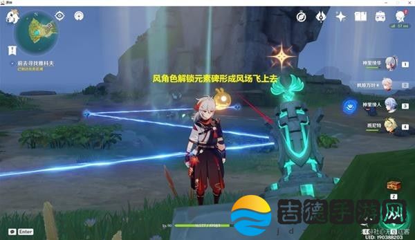 激活完成后,这个解谜位置的上方就会出现一个【传送黑洞】我们用利用风元素柱子,激活风场就可以飞上去了。