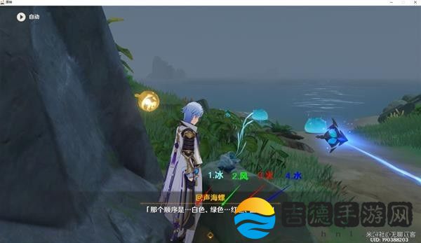 如上图所示:白色——冰元素,绿色——风元素,红色——火元素,蓝色——水元素,然后按照【1.冰2.风3.火4.水】这样的顺序点亮石碑就可以了