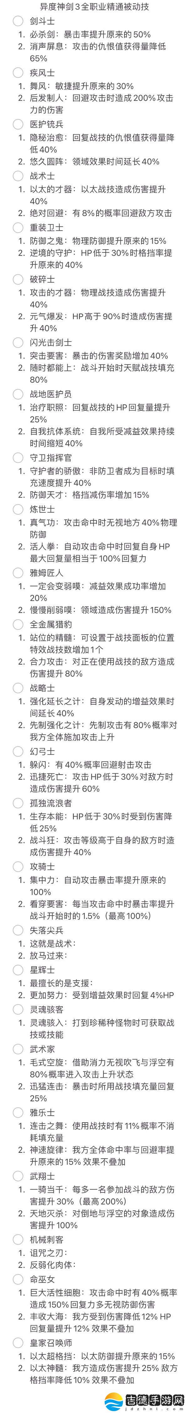 《异度之刃3》中有很多的职业分类,而各个职业的被动技能效果各不相同,想要了解职业技能的玩家请看下面“芳华如梦”带来的《异度之刃3》各职业被动技能汇总,希望能够帮助大家。