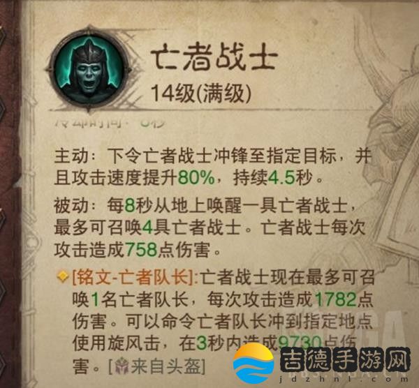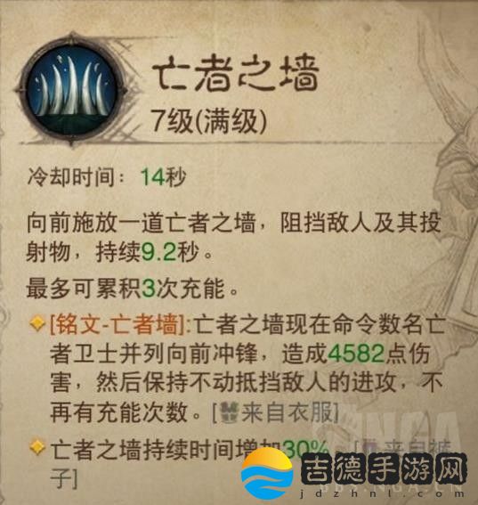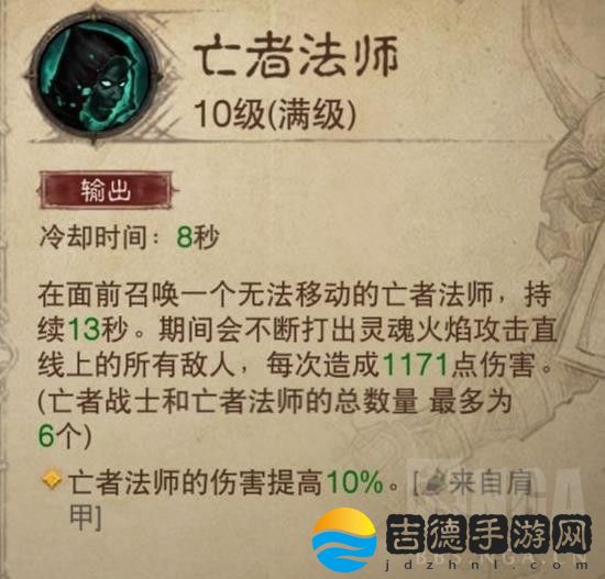 灵魂技能 亡者之墙会召唤出5个亡者卫士,这五个卫士算作召唤物可以吃满套装和宝石需求的召唤物数量,同时本身坦度非常高,而作为单位还可以有效的吸引怪物仇恨,是这套bd里的主坦技能