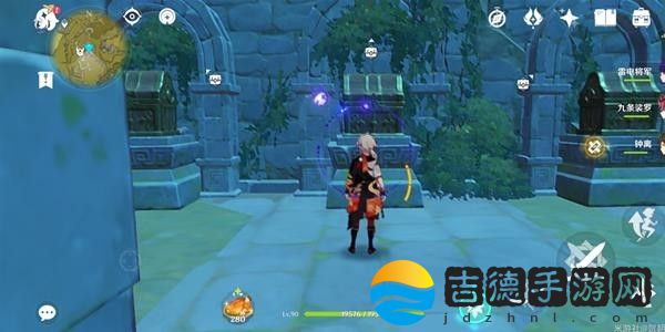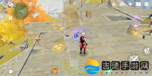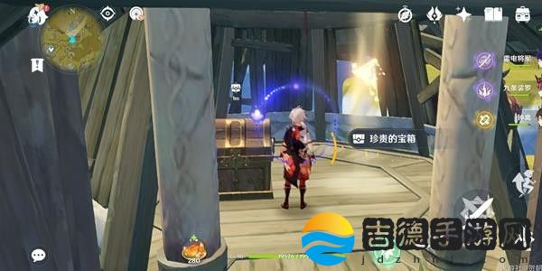 返回遗迹石碑,打开地图可以看到后边有一个遗迹,第三个△就在遗迹里。在门口这里把两旁的晶石打碎放到小塔里可以获得宝箱。